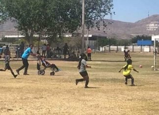 Padre impulsa a su hijo en silla de ruedas para que pueda jugar futbol