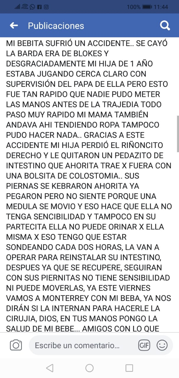 En sus publicaciones explica los hechos que pasaron, que en resumen es que una barda de blockes de piedra se derrumbaron encima de la menor, haciendo que esta perdiera su riñón derecho y le quitaran un pedazo del intestino que por el momento tiene de fuera en una bolsa de colostomia, también con esto a la menor se le rompieron las piernitas.
