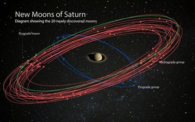 Cada una de las lunas recién descubiertas por un equipo dirigido por Scott S. Sheppard, de Carnegie, tiene unos cinco kilómetros de diámetro. Diecisiete de ellas orbitan el planeta hacia atrás, o en una dirección retrógrada, lo que significa que su movimiento es opuesto a la rotación del planeta alrededor de su eje. Las otras tres lunas orbitan en el progrado, en la misma dirección en que gira Saturno.